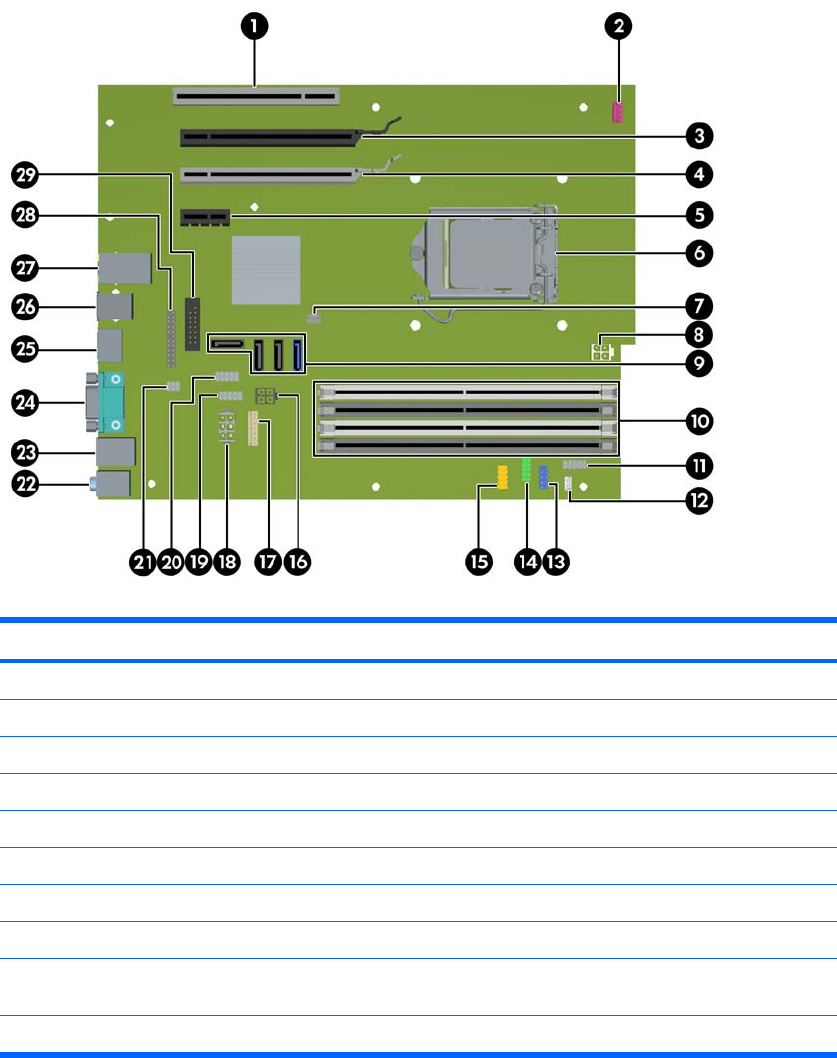 The following illustration and table identify computer system board components.